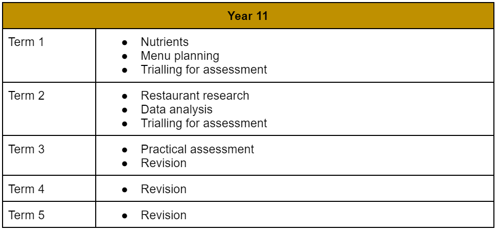 All students leave this subject being able to problem solve and support themselves nutritionally. They enjoy cooking, can work from detailed time plans and can organise and work together to hold a hospitality event with complete confidence. We give each student the tools to be independent and the ability to grow learning from their mistakes, attributes and qualities needed throughout their whole life.